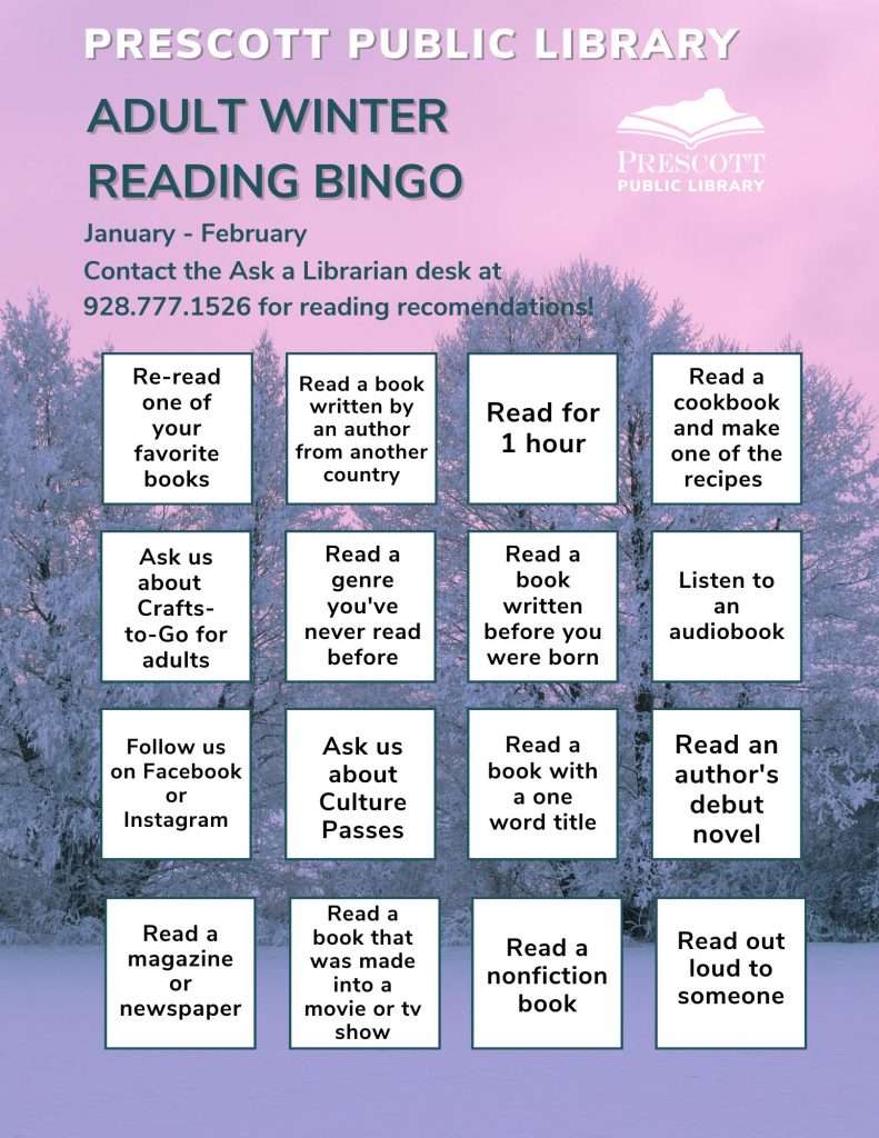 You are invited to play our Adult Winter Reading BINGO! Win a $5 gift card to a local business by completing a BINGO and be entered into a drawing to win one of six $25 gift cards! Adult Services librarians are happy to provide you with personalized reading suggestions. We also have online resources you can explore on your own to find your next great read. Bookpage is a discovery tool for readers, highlighting the best new books across all genres. NextReads lets you enjoy annotated introductions to books in twenty areas of interest. NoveList offers read-alikes, recommended reads by genre, discussion guides, and more for fiction and nonfiction books. You can access these resources on our website. They can be found in the “Services” tab under “Reading Recommendations.” Visit the Ask a Librarian Desk on the 2nd floor or call 928.777.1526 for reading suggestions, or for help using any of these resources. You can pick up a Bingo card at the library or print one out from our website. This program is for adults and ends February 28. Bingo cards must be returned by Thursday March 3, and the drawing will take place on Friday March 4.